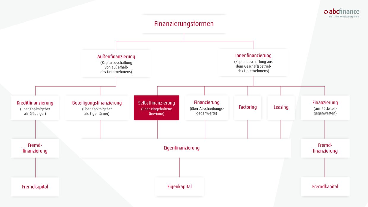 Die Selbstfinanzierung wird als Finanzierungsform sowohl der Innenfinanzierung als auch der Eigenfinanzierung zugordnet. Das heißt, dass die Finanzierung durch die Bildung von Eigenkapital und durch finanzielle Mittel aus dem Unternehmen selbst entsteht. Sie unterscheidet sich damit von der Fremdfinanzierung, bei der Fremdkapital aufgenommen wird und von der Außenfinanzierung durch externe Kapitalgeber.